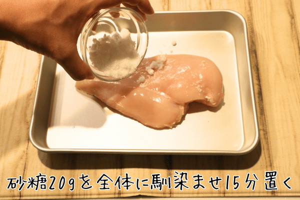 ①鶏むね肉を砂糖で保湿性を高める