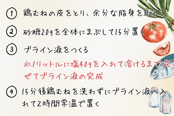 ②ブライン液につけて柔らかくジューシーにする
